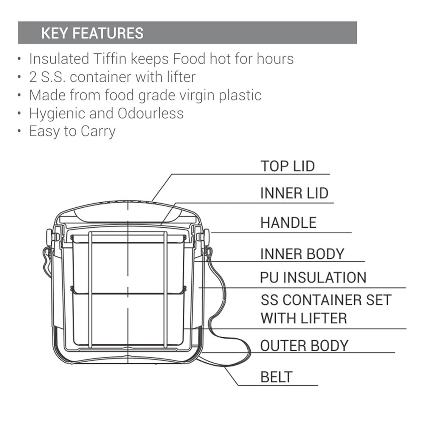 Econa deluxe has double-walled insulated containers that keeps food hot for hours. It has carry-case with strap, integrated handle for easy carrying.