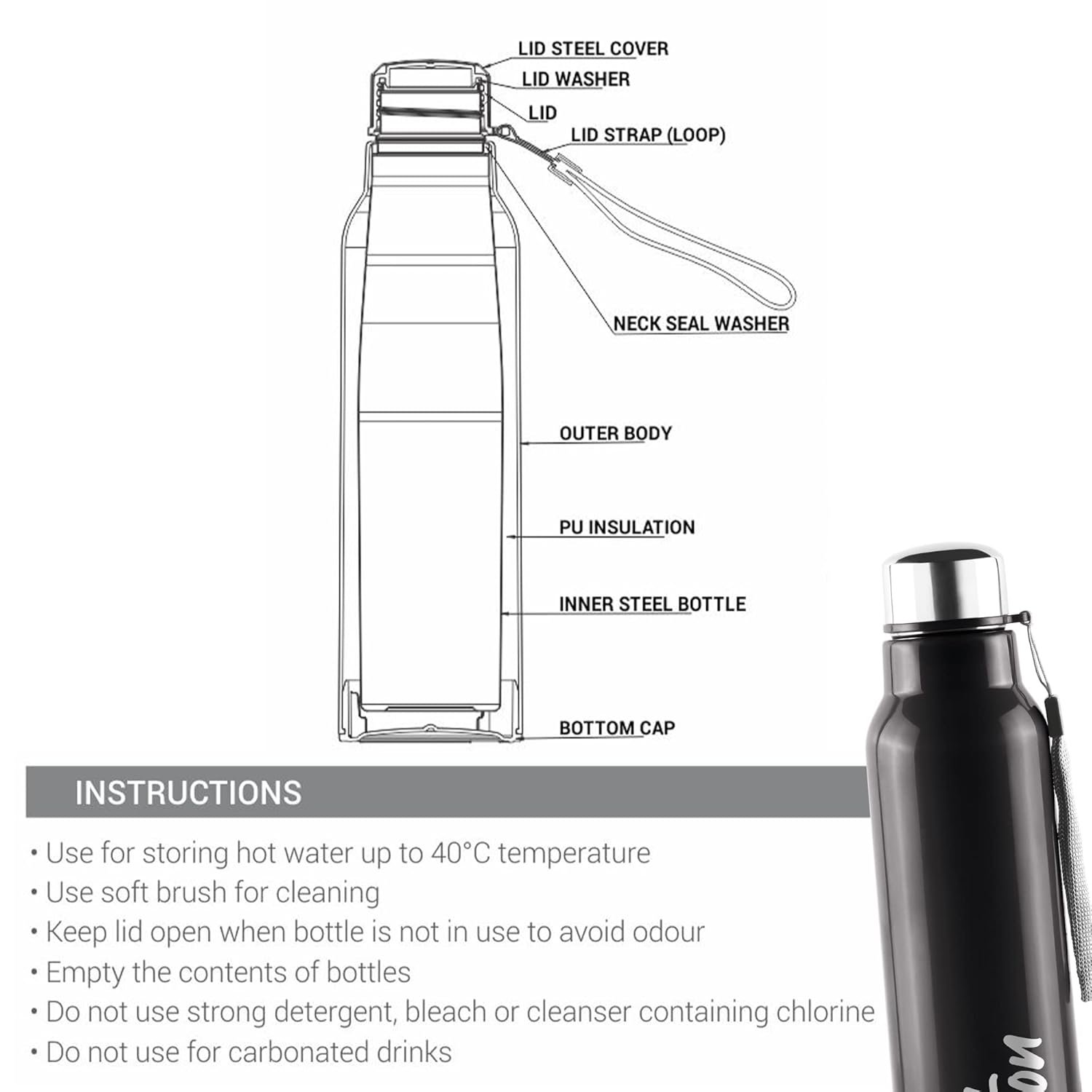 Milton Steel Fit 900 Insulated Stainless Steel Water Bottle, 1 Piece, 630 ml, Black | Easy Grip | Leak Proof | Hot or Cold | School | Office | Gym | Hiking | Treking | Travel Bottle