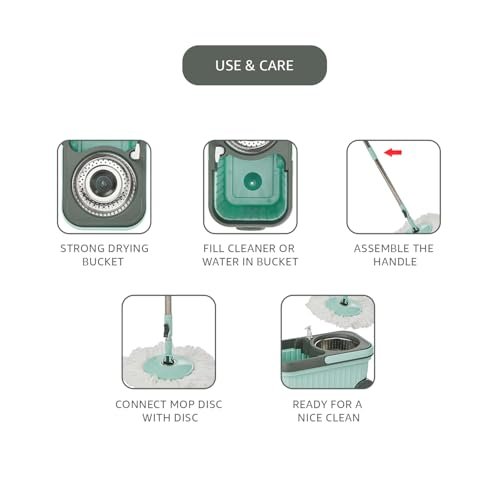 1.Twin Bucket Spin Mop for easy wringing and rinsing 2.Durable plastic build for long-lasting performance.