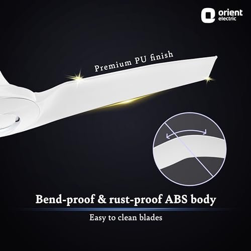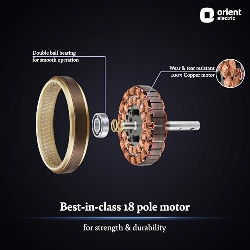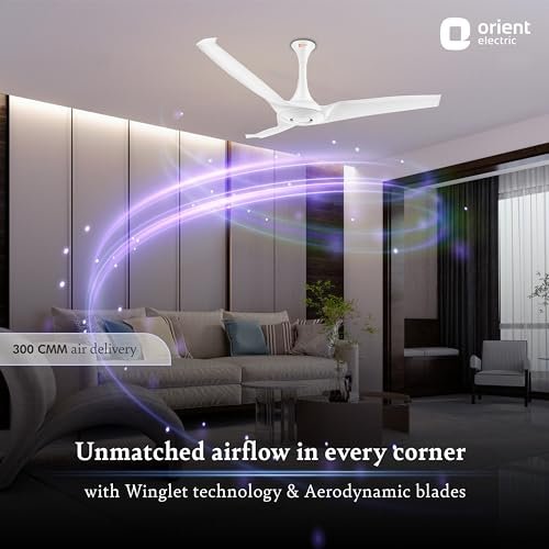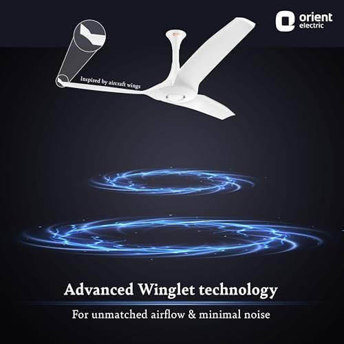 VERY SILENT, VERY EFFICIENT, VERY POWERFUL FAN: Inspired by the aerofoil-shaped wings of airplanes, Aerostorm belongs to Aero Series- Orient Electric’s series of premium fans that feature a revolutionary aerodynamic design for an unparalleled performance. ADVANCED WINGLET TECHNOLOGY FOR UNMATCHED AIRFLOW: The advanced Winglet technology & aerodynamic blades of the fan function seamlessly to offer an unparalleled airflow of 300 CMM. WHISPER-QUIET OPERATION FOR PEACEFUL ATMOSPHERE: The aerodynamic blades of the ceiling fan produce low air-cutting noise for a whisper-quiet operation, contributing to the peaceful atmosphere at home. BEND-PROOF & RUST-PROOF ABS BLADES: The high-quality blades are easy to clean & maintain with a premium PU finish. The ABS blades are made bend-proof and rust-proof to last long. BEST-IN-CLASS 18 POLE MOTOR: Strongest in the category, the 18-pole motor of the ceiling fan delivers powerful performance while resisting wear and tear. The 100% Copper motor adds to the fan’s durability. IDEAL FOR LARGE AREAS: With a sweep size of 1320 mm, this ceiling fan offers high-speed airflow in every corner, even in big living areas. The 52-inch ceiling fan moves a large volume of air in every rotation, making it an ideal choice for halls, meeting rooms, verandas, etc. TRENDY COLOR OPTIONS FOR MODERN INTERIORS: The Orient’s ceiling fan comes in four color options of White, Caramel Brown, Mystic Gold, and Charcoal Grey to enhance your home interiors.