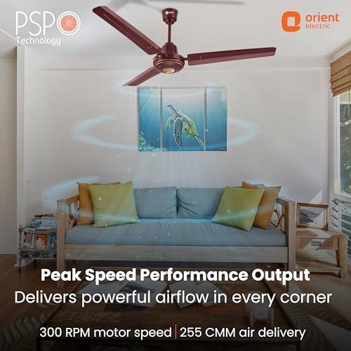 PEAK SPEED PERFORMANCE OUTPUT: This Orient PSPO ceiling fan delivers high airflow with every corner of 300 RPM and an air delivery of 255 CMM. STRONG 18-POLE MOTOR: The ceiling fan for home is equipped with a best-in-class 18-pole motor that is strong and durable and resists wear and tear, hence gives the long-lasting operation. SMOOTH & LASTING OPERATION: This fan one of the high-performance ceiling fans for home that are equipped with a double ball bearing for smoother operation and lasting functionality. ORNAMENTAL BOTTOM DESIGN: This 1400mm ceiling fan comes with an ornamental bottom design that adds vintage flair to your interiors. The ceiling fan is superior in both form and functionality. ANTI-RUST ALUMINIUM BLADES: The high-quality Aluminium blades of this Induction ceiling fan are made anti-rust for longevity & ease of maintenance. TRENDY COLOR OPTIONS: Choose from four trendy color options of White, Brown, Smoke Brown and Ivory, and give your ceiling a pop of color. A PROMISE OF QUALITY WITH 5-YEAR WARRANTY: Built to last long, Summercool ceiling fan is protected against manufacturing defects with a 5-year warranty. PAN-INDIA SERVICE: Our strong, PAN-India service network spans over 650+ cities and 17000+ PIN codes.