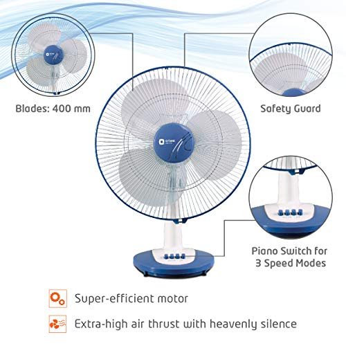 Aerodynamically designed resin blades for maximum air delivery 3-speed piano switch control;90 degree oscillation Adjustable upward and downward tilt mechanism;Easy snap fit assembly Extra protection with powder coated guard with polymer ring;Motor protected through thermal overload protection device; Warranty: 2 years on product;Power: 53 watts Controller Type: Button Control; Material Type: Polypropylene Copolymer; Mounting Type: Tabletop Aerodynamically designed resin blades for maximum air delivery 3-speed piano switch control