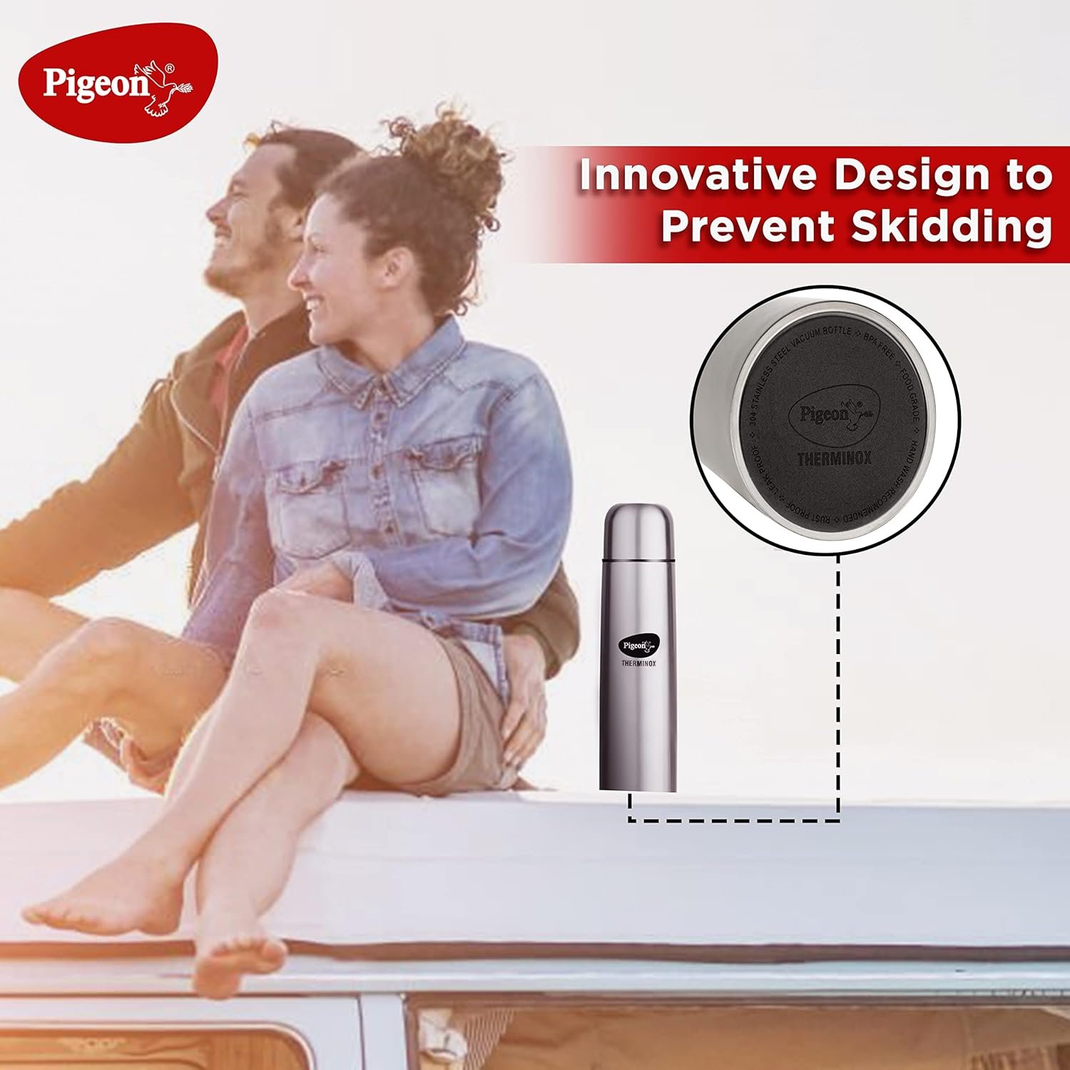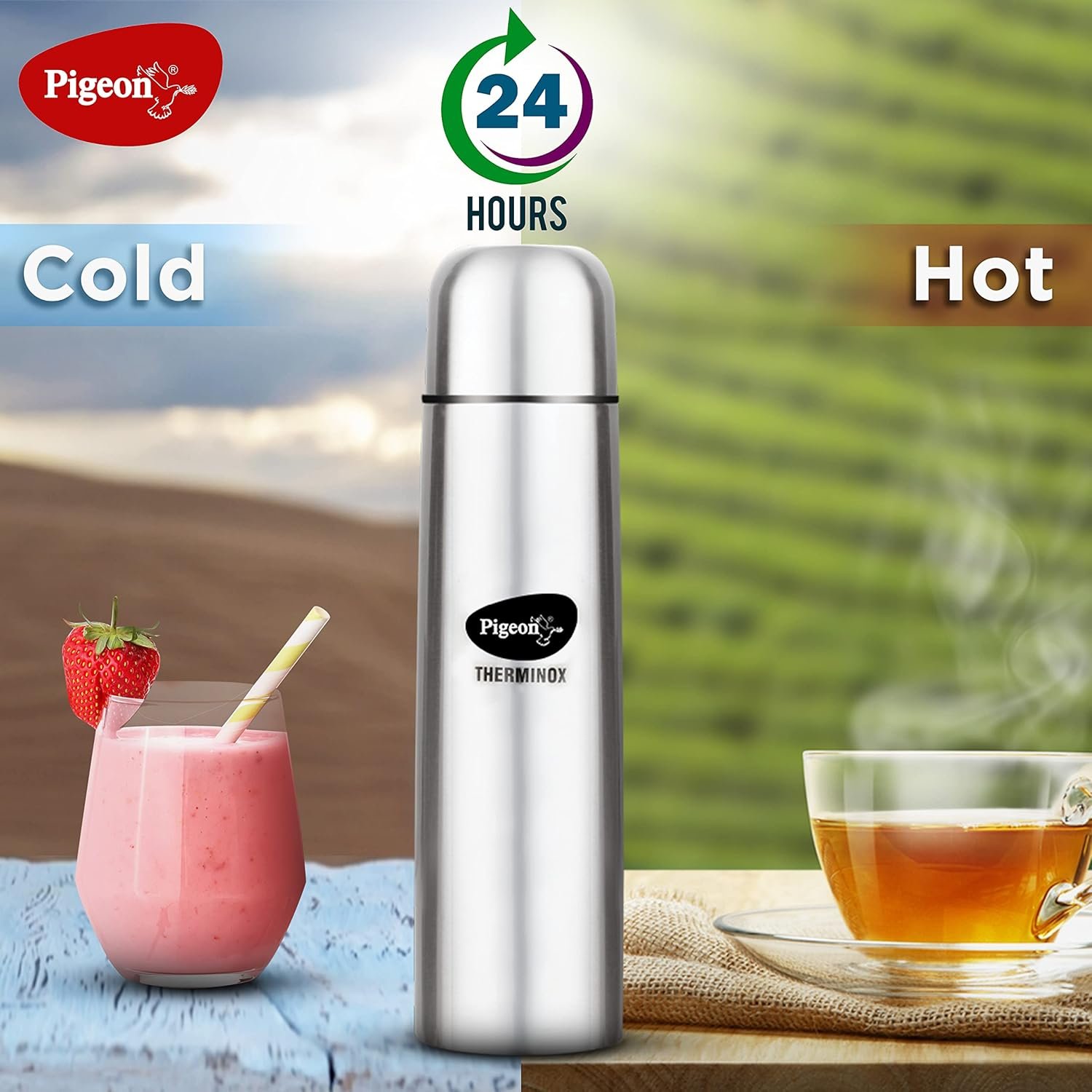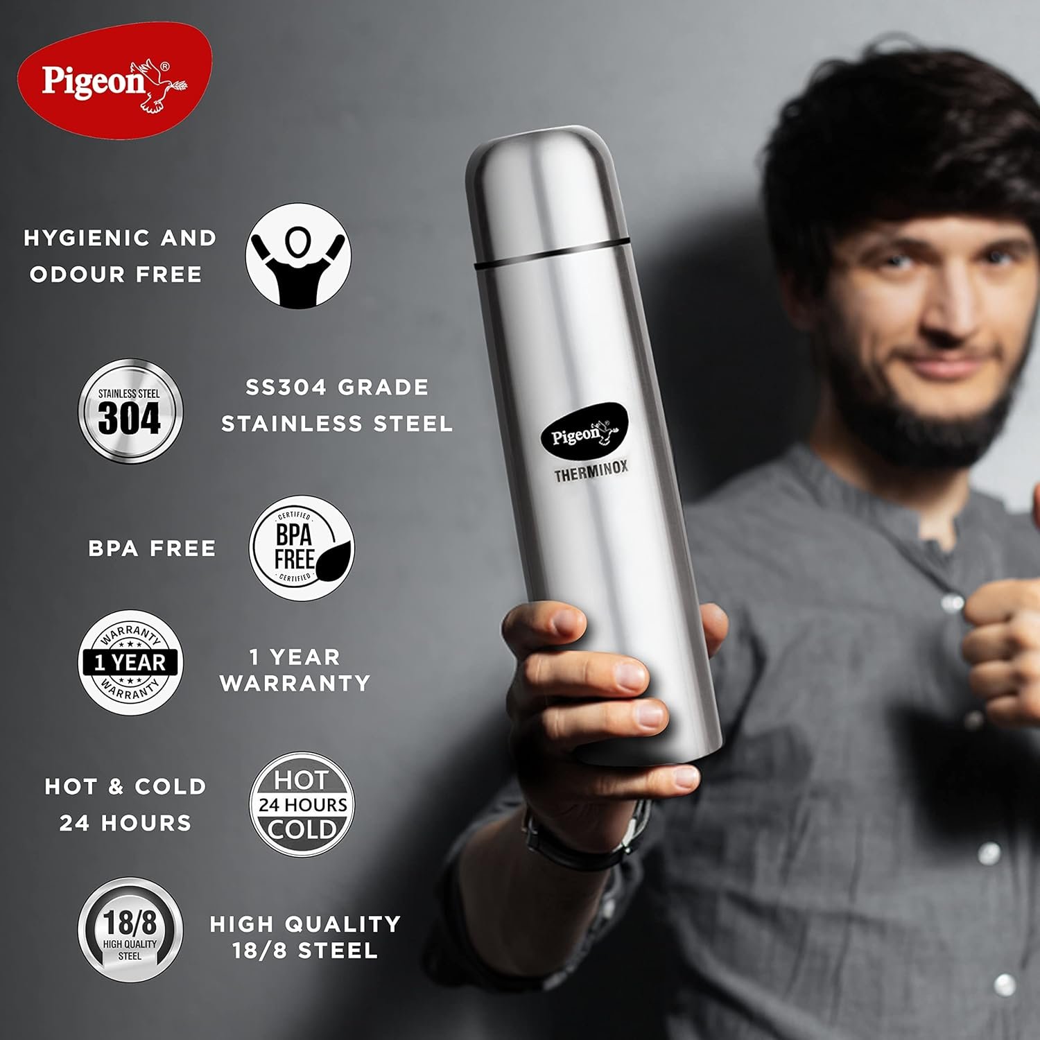 This is Pigeon’s Therminox Bullet vacuum flask made of high quality “Double Walled Stainless Steel” (SS304). This product has BPA free material with a flip type lid to make it easy for you to enjoy every sip.
