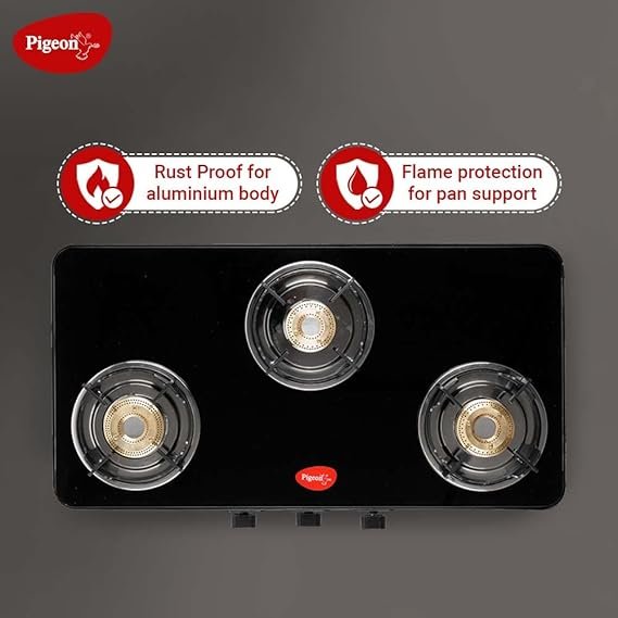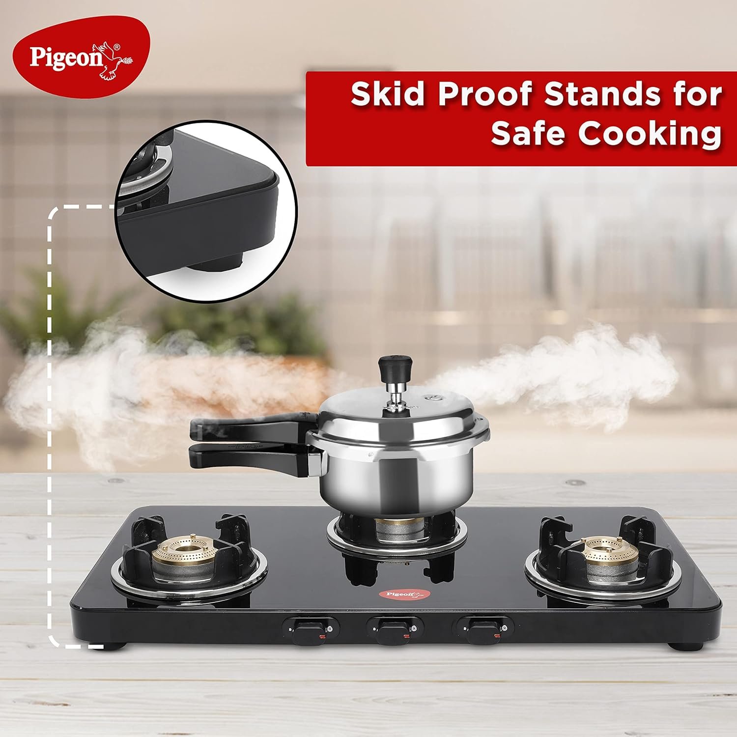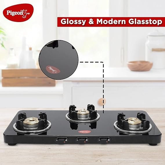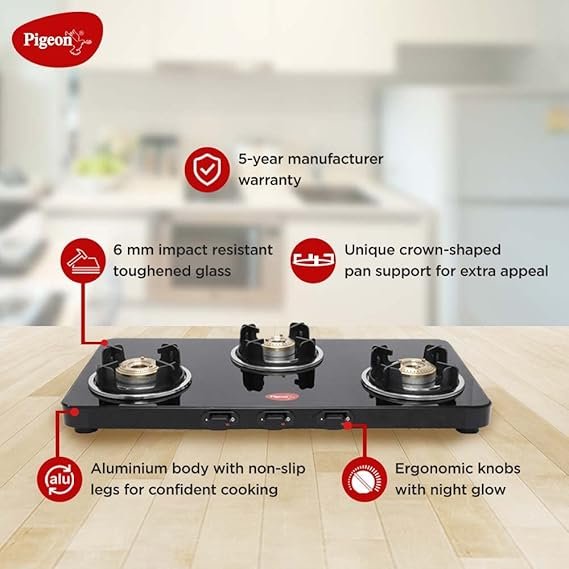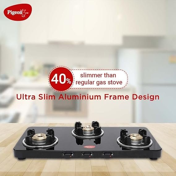 Pigeon by Stovekraft Sleek 3 Burner Ultra Slim Gas Stove with Glass Top, Manual, Black