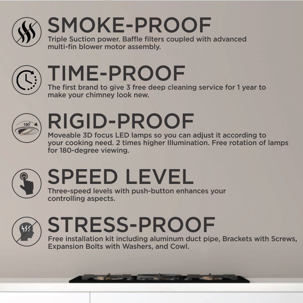 • Time Proof : The first brand to give 3 free deep cleaning service for 1 year to make your chimney look new.