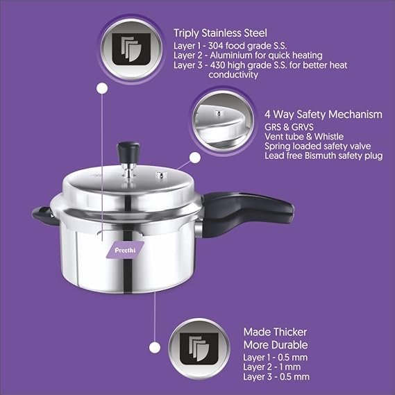 Triply stainless steel get heated up quickly with even heat distribution, thereby making cooking easy.<br>3 Layer Pressure cooker:<br>Layer 1 : 304 Food Grade Stainless Steel <br>Layer 2 : Aluminium for Uniform Heat distribution<br>Layer 3 : Highly durable magnetic Grade SS for better life and induction compactable