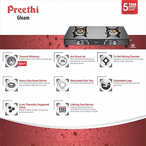 Better Spacing between burners for enhanced ease of cooking 69+% Thermal Efficiency: Enables you to cook faster and save gas. Thermally Toughened Glass: 8mm thick thermally toughened glass top makes it highly durable, long lasting and heat resistant. Heavy Duty Brass Burner: improved durability, faster cooking and consistent efficiency for years. Tripad Mixing chamber : Supports optimum mixture of air & gas ratio for increased efficiency. Ant guard Jet : Ensure smooth functioning of gas stove for years & minimize low flame issues Removable Drip Tray: To ensure mess-free cooking. Extendable legs: Enables easy cleaning below the gas stove. Lighter holder: Provision to hold the lighter.