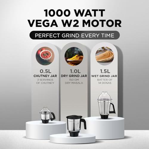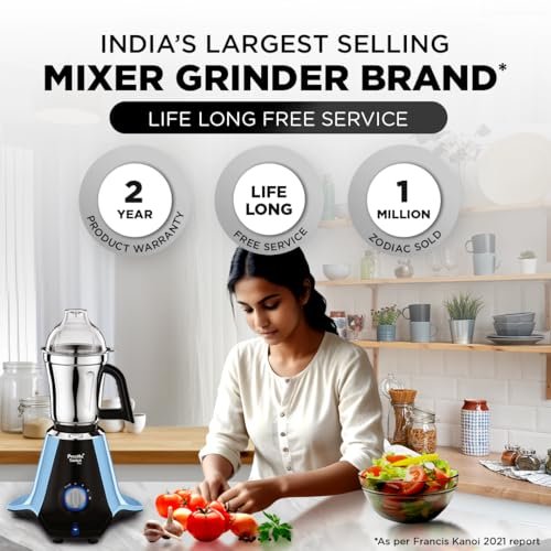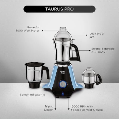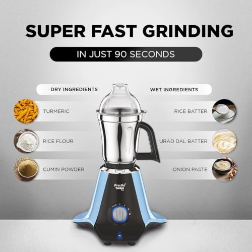 India’s No 1 Mixer-Grinder Brand(as per Francis Kanoi) ; Performance Features: This Preethi mixer grinder has a powerful motor that ensures robust operations Stainless steel Jar & Blade – These Jars are made using high quality stainless steel & high precision for performance. They also go through water load test to ensure stability & endurance test for the blade (10 hrs) Strong, durable ABS Body which has high tensile strength & can withstand heavy use Powerful 1000 Watt motor for perfect grinding in 90 sec 2 Year Product Guarantee, Life long free Service – No Labour Charge High RPM :19000 RPM with 3 speed control & incher Product Decibel level: 88 Db, noise level similar to hair dryer