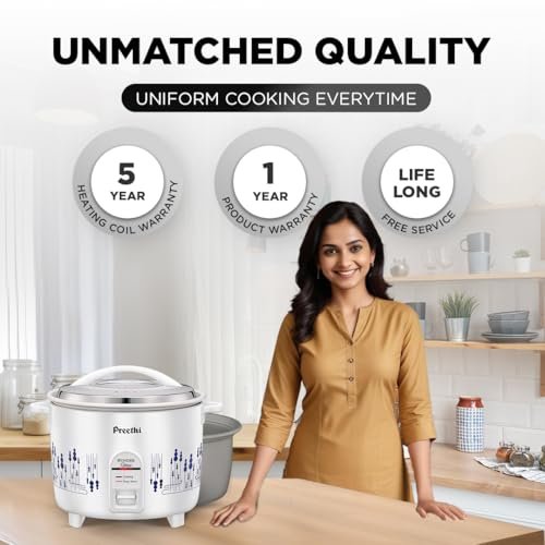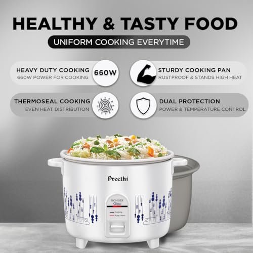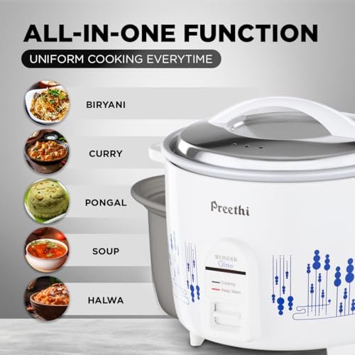 Fast, & Easy Cooking : Make Rice, Pulao, Idli, Pongal, Sambar, Soup, Curry, Halwa, Chicken Biriyani etc with Electric cooker. Anodized Aluminium Pan : Thicker pans making it highly durable and rustproof. Overlapped Heating Coil : Overlapping heating elements ensure there are no thermal blind spot thereby helping you with uniform cooking. Rust Proof Body : Superior Electro Static spray painting makes it look new even after years of usage. Double Protection : Thermal fuse and micro switch are interlinked to protect the rice cooker from power fluctuation. Included components: measuring cup, spatula