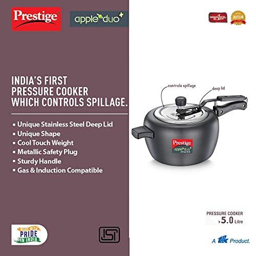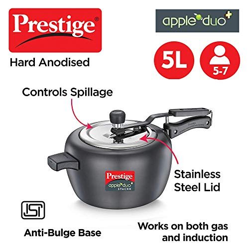 Bring home a revolutionary new cooker that completely transforms your kitchen experience, keeping you safe and happy in the kitchen. The Prestige Apple Duo Plus Svachh is a stunning new pressure cooker that you would want to flaunt at the dining table. Preparing healthy meals could not be done with more class than this premium pressure cooker. The unique Svachh lid contains any spillage that might occur during the course of cooking, keeping your kitchen safe and cleaner than compatible.