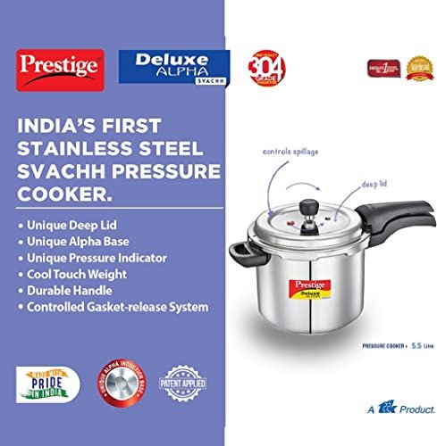 The Prestige Deluxe Alpha Svachh Pressure cookers are made using the best quality stainless steel, which makes it perfect for any kitchen. Its unique Alpha base is designed for even distribution of heat and is also induction compatible. What’s more, it also features built-in safety mechanism in the form of pressure indicators, safety plug and controlled Gasket-release system