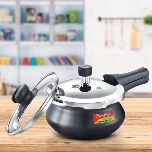 The all-new Prestige Deluxe Duo Plus Pressure Cooker comes with a hard anodised body and an elegant stainless steel lid.