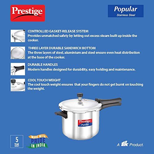 Flat lid Precision weight valve.Amount of Rice Cooked: 500 grams Metallic safety plug Color: Silver, Material: Stainless Steel Package Contents: 1-Piece Pressure Cooker (5liters) Warranty: 5 year manufacturer warranty