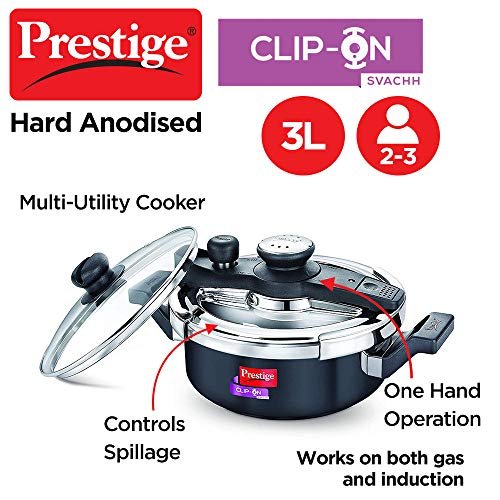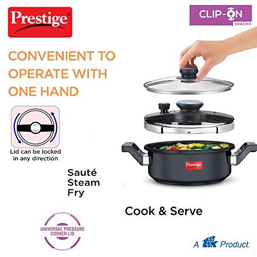 Bring home a revolutionary new cooker that completely transforms your kitchen experience, keeping you safe and happy in the kitchen. The lid can be placed in any position and closed safely. It also comes with a pressure indicator ensuring maximum safety. Use the unique glass lid to sauté, steam, fry, boil, cook and even serve. The Prestige Clip-On Svachh pressure cooker range is modular in design, which means you can use the same lid on all utensils in the range.