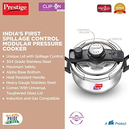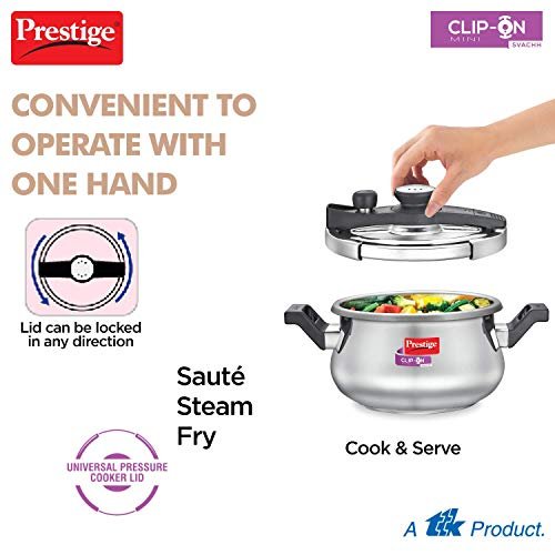 Bring home a revolutionary new kadai that completely transforms your kitchen experience, keeping you safe and happy in the kitchen. The lid can be placed in any position and closed safely. It also comes with a pressure indicator ensuring maximum safety. Use the unique glass lid to sauté, steam, fry, boil, cook and even serve. The Prestige Clip-On Svachh pressure kadai range is modular in design, which means you can use the same lid on all utensils in the range.