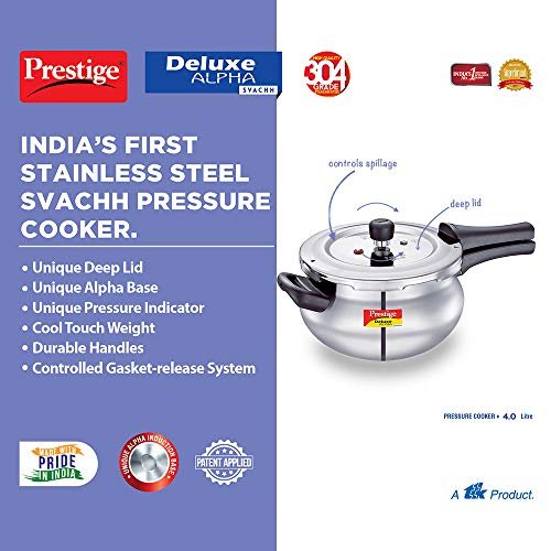 The Prestige Deluxe Alpha Svachh Pressure cookers are made using the best quality stainless steel, which makes it perfect for any kitchen. Its unique Alpha base is designed for even distribution of heat and is also induction compatible. What’s more, it also features built-in safety mechanism in the form of pressure indicators, safety plug and controlled Gasket-release system. Also, the Svachh lid contains any spillage that might occur during the course of cooking and prevents the messy liquid from dripping down