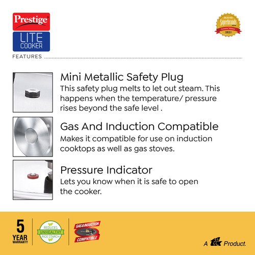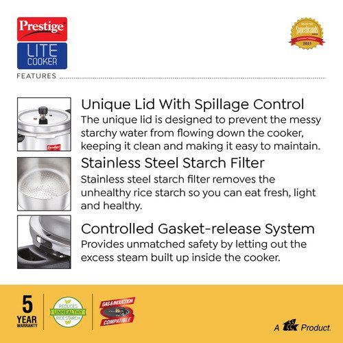 It is time to welcome rice back into your life with Prestige’s new Svachh Lite Cooker. The stainless starch filter drains the starch away from the rice, making sure you eat fresh, light and healthy. The unique svachh lid contains any spillage that might occur during the course of cooking, keeping your kitchen safer and cleaner than ever before.