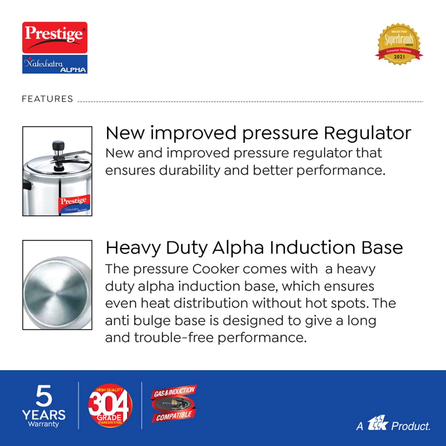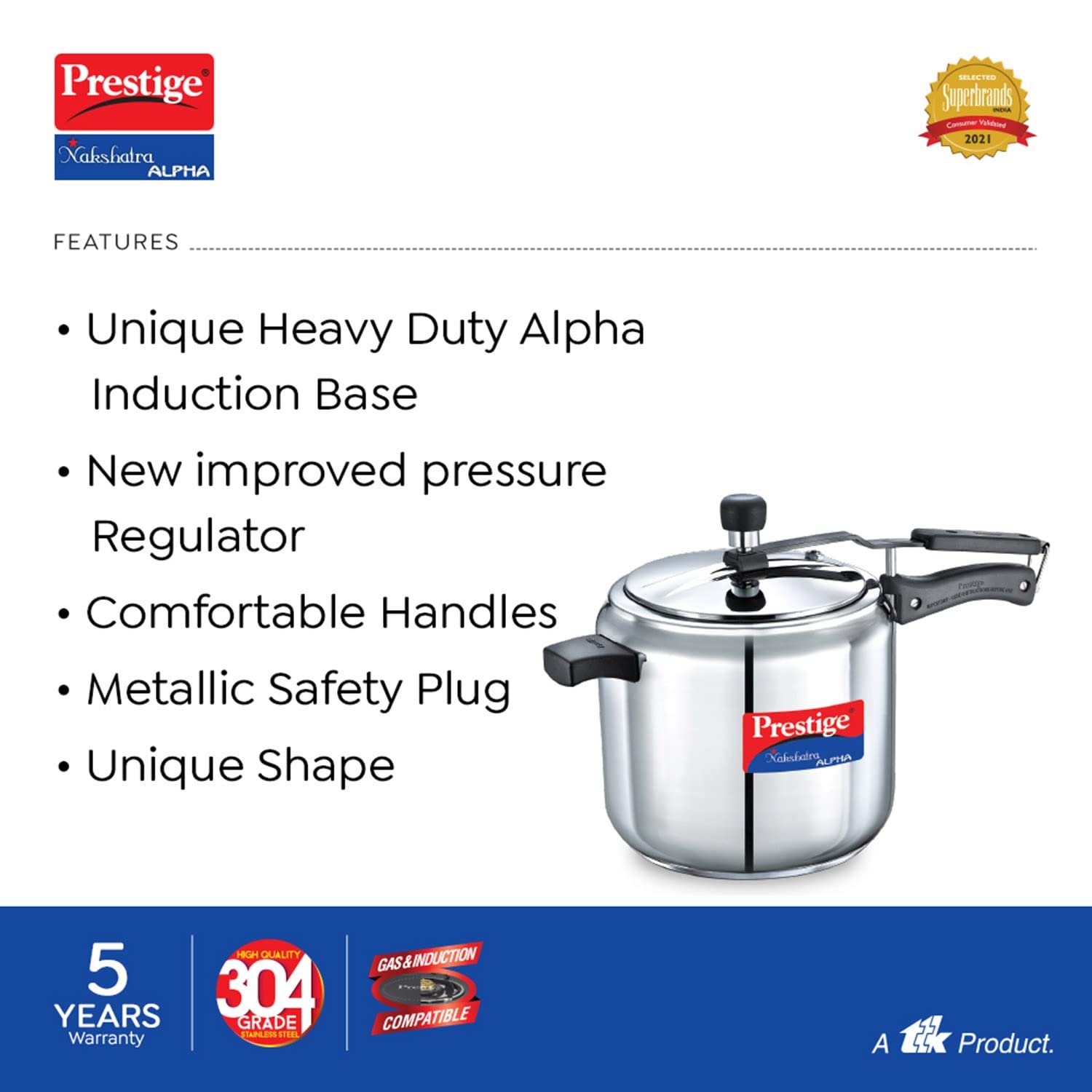 The all new Prestige Nakshatra Alpha Svachh stainless steel pressure cooker is designed and engineered for unmatched durability. This stunning pressure cooker comes with loads of features that include a heavy duty alpha base suitable for induction cooking as well as traditional cooking. The unique Svachh lid contains any spillage that might occur during the course of cooking, keeping your kitchen cleaner.