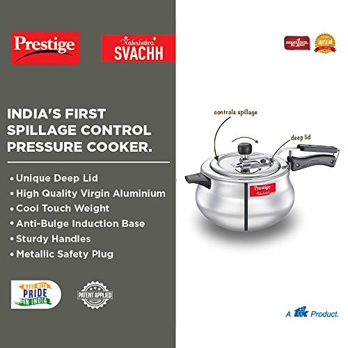 Materia type: Aluminium; Base type: Gas & Induction Compatible Base; Capacity: 5 L; Lid type: Inner Lid; Base thickness (in mm): 3 mm; Weight: 1.55 kg; Colour Silver; Warranty: 5 years For any issues, contact_us on: [1800-123-334464] Bring home a handi that helps you keep the kitchen clean and safe. The Nakshatra Plus Svachh Pressure handi is designed to last longer and comes with a unique lid that contains any spillage that might occur during the course of cooking and prevents the messy liquid from dripping down. Not only is it gas and induction compatible but comes with added safety features that makes it one of the most reliable handi for your kitchen. Induction Compatible Base Handi deigned