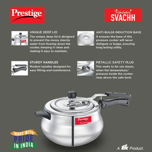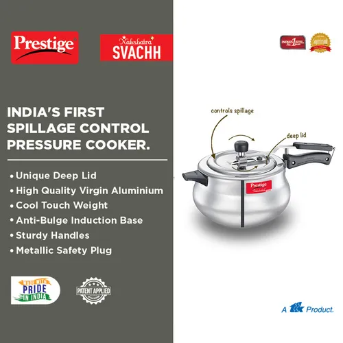 The Nakshatra Plus Svachh Pressure Handi is designed to last longer and comes with a unique lid that contains any spillage that might occur during the course of cooking and prevents the messy liquid from dripping down.