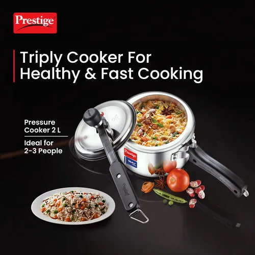 • Upgrade your kitchen with the Prestige Triply Svachh Inner Lid Pressure Cooker (2 Litre), designed for efficient and mess-free cooking. Built with advanced triply stainless steel technology, this cooker ensures uniform heat distribution for faster and healthier cooking. The unique Svachh spillage control design helps prevent messy overflow, keeping your kitchen clean at all times.