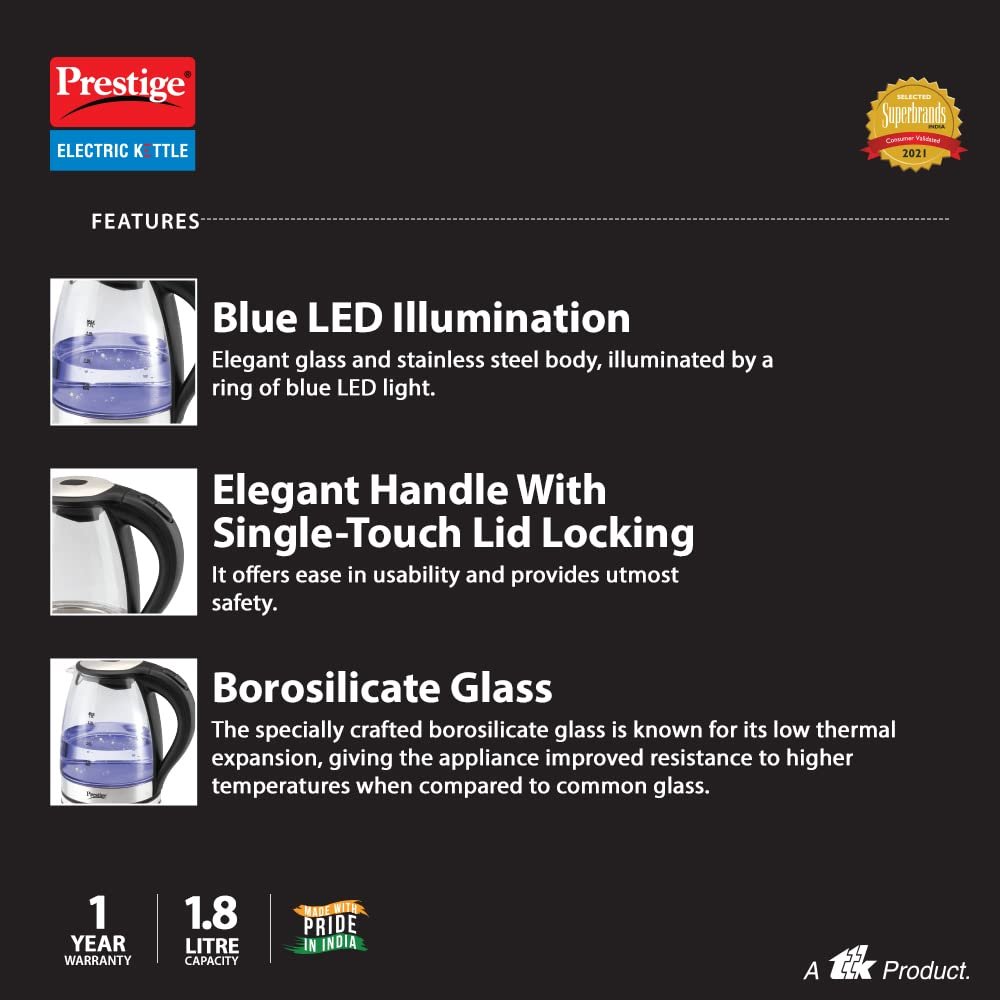 Prestige Glass Kettle Pgkl, 1.8 Litre, 1500 Watts, Transparent