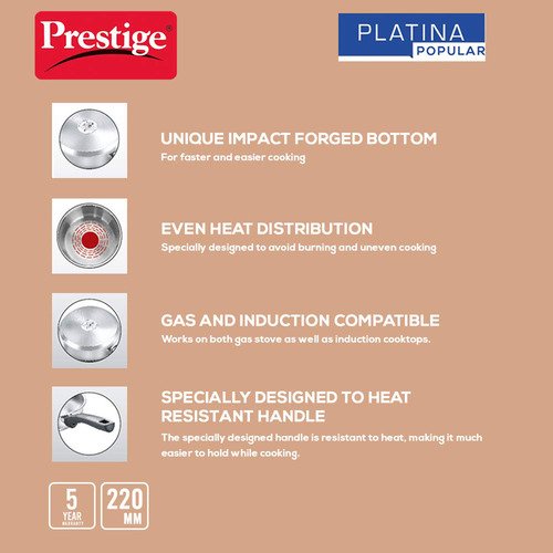 The Platina cookware comes with unique Impact Forged Bottom that ensures your food cooks fast and fries evenly. Its thick bottom also ensures that the food does not get burnt at higher temperature. Designed for perfection, the Platina cookware is an elegant addition to your kitchen that does more than just look good. It is strong and long lasting, and the design also saves energy