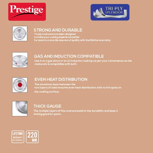 Bring home a life long partner with the new Prestige Tri-ply cookware. With its unique steel and aluminum base, it lasts long, cooks evenly, and looks good too. Not only is it gas and induction compatible but comes with added safety features that make it one of the most reliable cookware for your kitchen. Be assured of perfect results each time and have complete control over your cooking