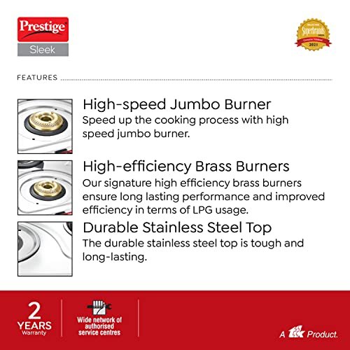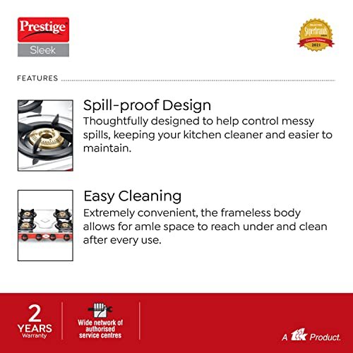 High-efficiency Brass Burners: Our signature high efficiency brass burners ensure long lasting performance and improved efficiency in terms of LPG usage. High-speed Jumbo Burner: Speed up the cooking process with high speed jumbo burner. Durable Stainless Steel Top: The durable stainless steel top is tough and long-lasting. Spill-proof Design: Thoughtfully designed to help control messy spills, keeping your kitchen cleaner and easier to maintain. Easy to Clean: Extremely convenient, the frameless body allows for ample space to reach under and clean after every use. 2 Years Manufacturer Warranty on the product