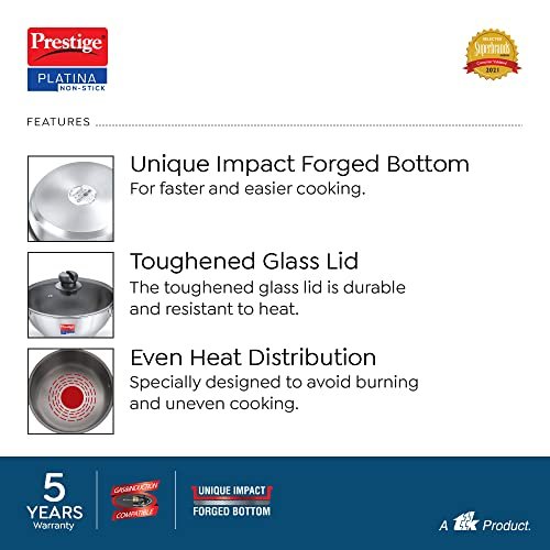 The Platina Non- Stick is a unique four layered Coated stainless steel cookware that uses less oil, is scratch resistant and metal spoon friendly. It comes with a Unique impact forged bottom, ensuring food cooks fast and evenly