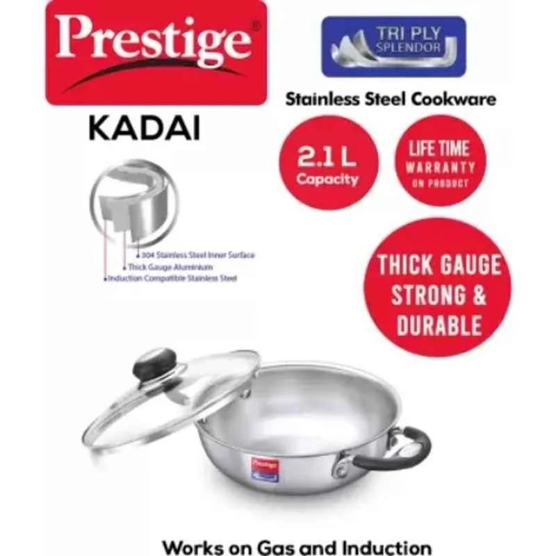 The Prestige Tri Ply 22cm Stainless Steel Non-Stick Kadhai with Lid 2.1 Litre Capacity & Induction Bottom, 37423 is a versatile and durable addition to your kitchen. With its unique tri-ply construction, this kadhai ensures even heat distribution and retention, resulting in perfectly cooked meals every time.