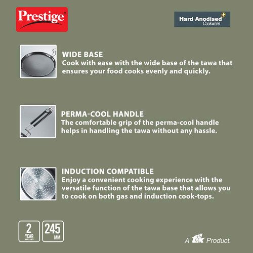 Experience new-age cooking with Prestige Chapati Tawa cookware. The latest range of anodised cookware is gorgeous and packed with never before features. The cookware has no coating, and is completely made of anodised aluminium, ensuring that there is no peeling or damage to the cooking surface. The material is twice as hard as stainless steel thereby guaranteeing legendary strength and durability