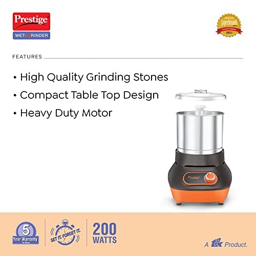 Prestige Vertical Wet Grinder with timer PRG 2.0 – Truly a versatile Kitchen Appliance: Grind batter for crisp dosas, soft idlis or fluffy vadas and Knead dough for soft chapatis, now with the convenience of a timer. Just set the timer for the desired duration and the device will trun off after it has elapsed freeing you from the constant monitoring. Prestige wet grinders, manufactured with highest quality material, are designed specially to handle your wet grinding jobs effortlessly, making it a truly versatile companion for you in your kitchen.