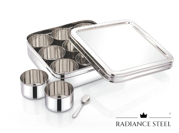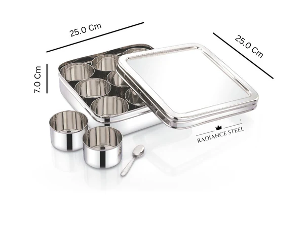 Modern square masala dabba crafted from premium food-grade stainless steel