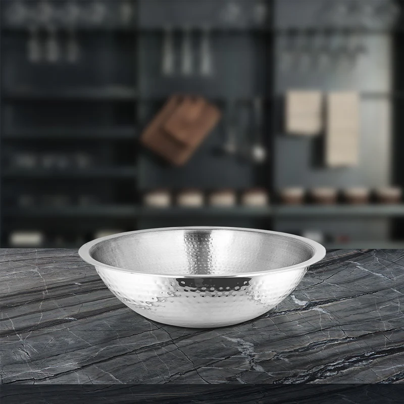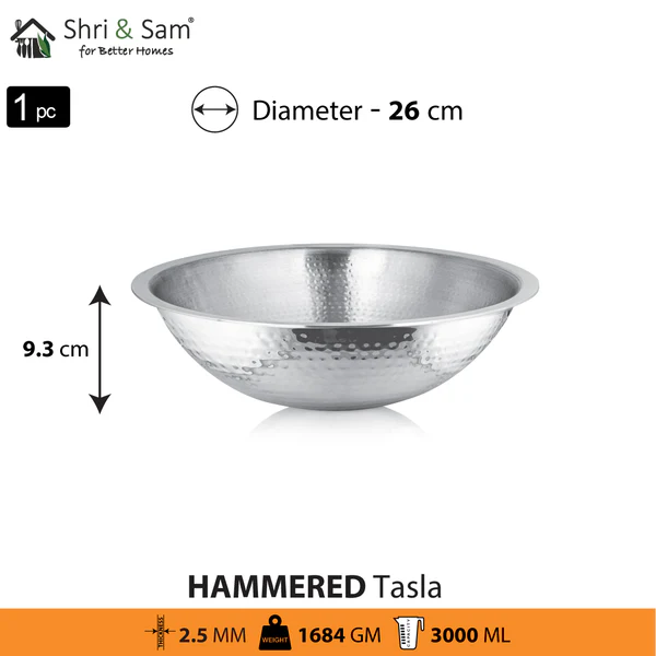 This hammered Tasla by Shri and Sam is built with premium and heavy quality stainless steel, with a thickness of 2.5 MM which is rust-free and highly durable. This tasla is in steel color and has a shiny finish to it which makes it suitable for any type of kitchen.