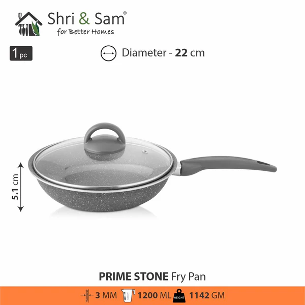 This Primestone Fry Pan with Glass Lid by Shri and Sam is built in heavy gauge aluminum that has a non-stick coating. Comes with a soft touch handle that smoothens the grip on your hand while lifting it. This Fry Pan is easy to maintain and takes less space in your kitchen