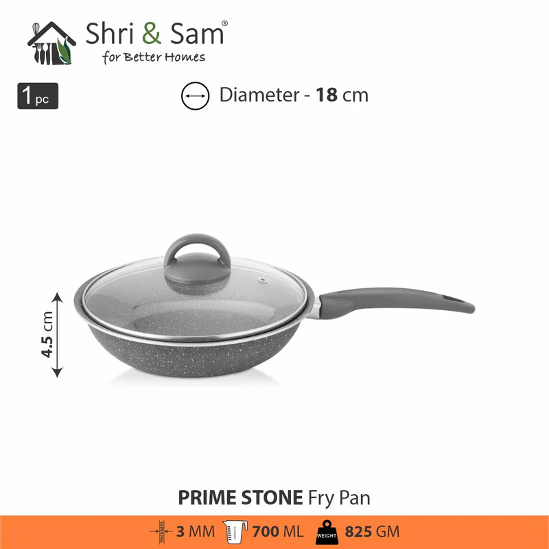 This Primestone Fry Pan with Glass Lid by Shri and Sam is built in heavy gauge aluminum that has a non-stick coating. Comes with a soft touch handle that smoothens the grip on your hand while lifting it. This Fry Pan is easy to maintain and takes less space in your kitchen.