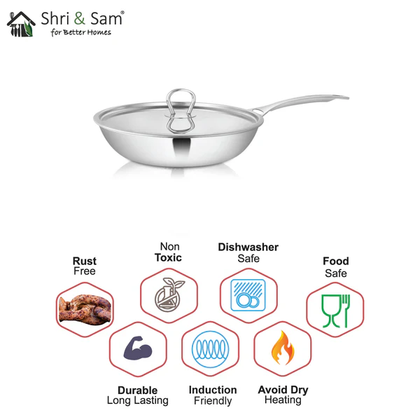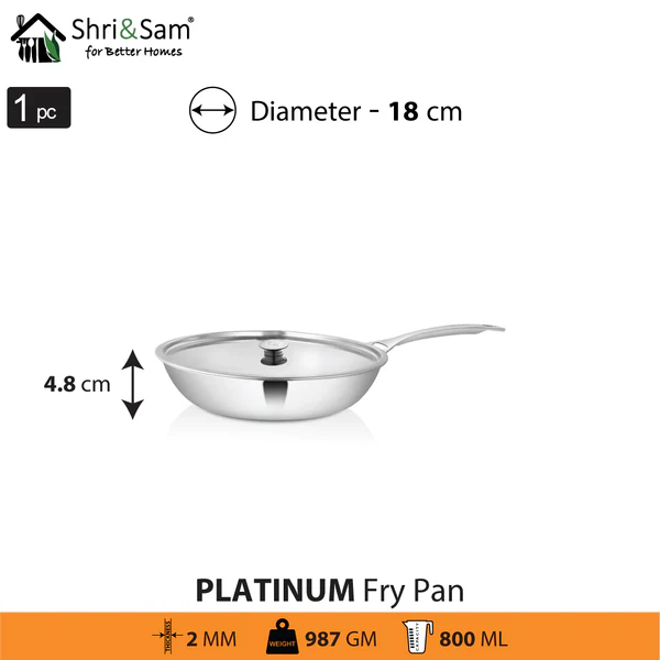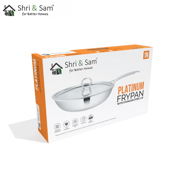 Platinum Series by Shri and Sam is highly durable and rust-free. This product is made from premium quality 430 stainless steel, it is Food Grade and Food Safe. this Fry pan is in a shiny finish which will make it suit any type of kitchen counter. This Fry Pan also comes with a stainless steel lid for all types of cooking processes. This Fry pan has a sturdy stainless steel handle, it also has a very good grip.