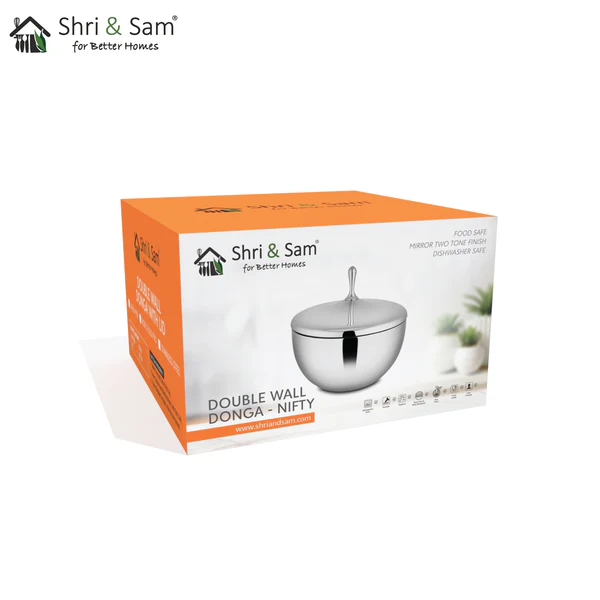 This donga by Shri and Sam is built with superior quality stainless steel that is silver in color and has a shiny mirror finish on the outside which makes it look good on any kind of table setting. This product has a matt finish on the inside. This product has a simple and elegant design, which makes it a handy serving tool. This can be used to serve several things like dal, rice and chicken etc.