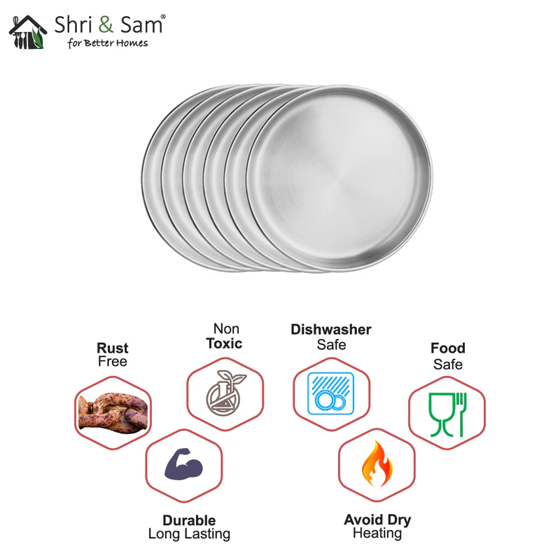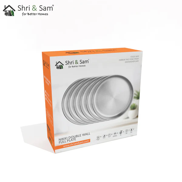 This Shri and Sam 6 pcs Nikki Full Plates gives you everything you need in a kitchen. These plates have double-wall which helps them being at a normal temperature from the outside while there is a hot item in them. These plates are silver in color and have a mirror finish to them, moreover, as double-walled, it helps the food to stay in the same condition for a longer duration than usual.