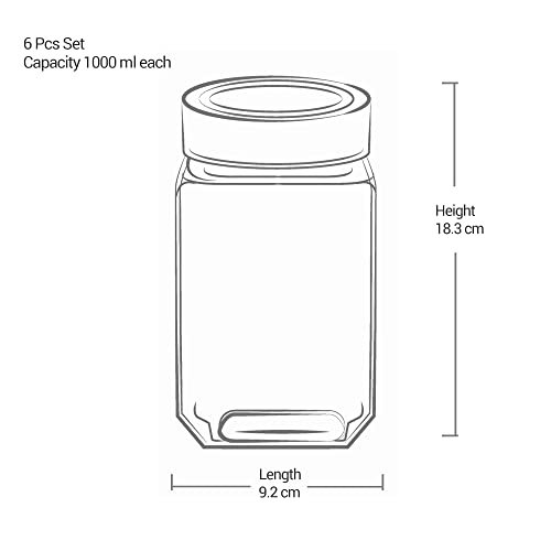 Colour: Transparent; Material: Glass; Package Content: 6 – Piece Cube Storage Glass Jar Set (1000ml Each); Dimension in cms (L x W x H): 9.2 x 9.2 x 18.3. Preserving your food in clear jars is a terrific way to avoid waste and create variety in your daily routines. A pantry full of this classy storage solution will not only look super organized but also stylish and modern. This glass jar is transparent which helps to identify inside contents easily. It is quite handy to operate, steel finish transparent lid for see through vision of the jar content Make your kitchen counter and pantry organized with this stylish jar. Few items are as versatile as the multipurpose jar. With its traditional reputation as a basic household need, the glass jar is great to store and organize all sorts of things. Preserving your food in clear jars is a terrific way to avoid waste and create variety in your daily routines.
