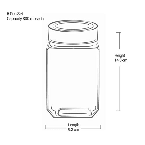 Colour: Transparent; Material: Glass; Package Content: 6 – Pieces Cube Storage Glass Jar Set (800 ml Each) [HEALTH & SAFETY]: Our glass spice jars are made from non-toxic, BPA-free materials, ensuring they are absolutely healthy and safe for your family. Airtight, Leak-Proof Cubical Glass Jar: Designed for safe and efficient storage of kitchen items, this glass jar features an airtight and leak-proof seal to keep contents fresh and secure. Its cubical shape is perfect for modular kitchens, optimizing space and organization. The transparent glass allows for easy identification of contents, making it simple to locate what you need at a glance. Neat and Tidy: Stacking jars can help create a more organized and visually appealing storage solution. It keeps your items contained and reduces clutter. Multipurpose- These cube jars have multiple uses, including storing cereal, rice, sugar, noodles, coffee beans, candy, dried fruits, and other essential pulses.