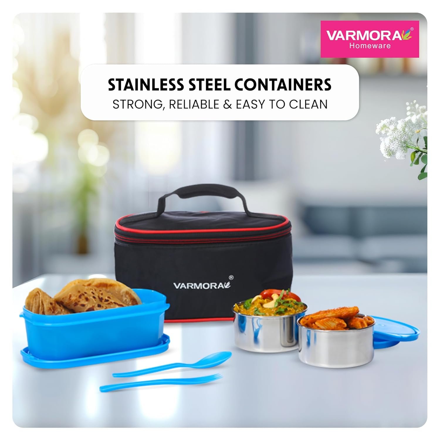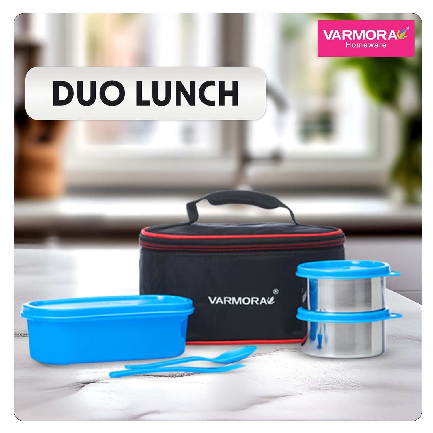 Solution: The SS Duo Stainless Steel Lunch Box Set  by Varmora offers a thoughtful solution to these mealtime challenges