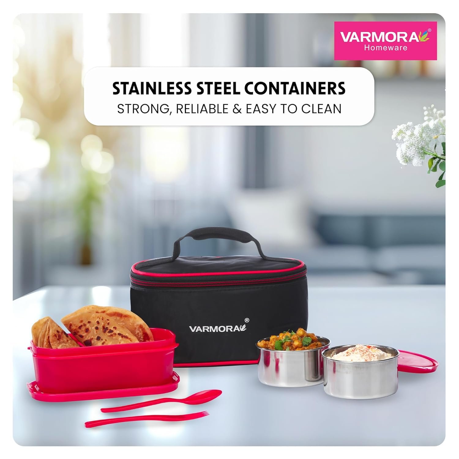 Solution: The SS Duo Stainless Steel Lunch Box Set  by Varmora offers a thoughtful solution to these mealtime challenges