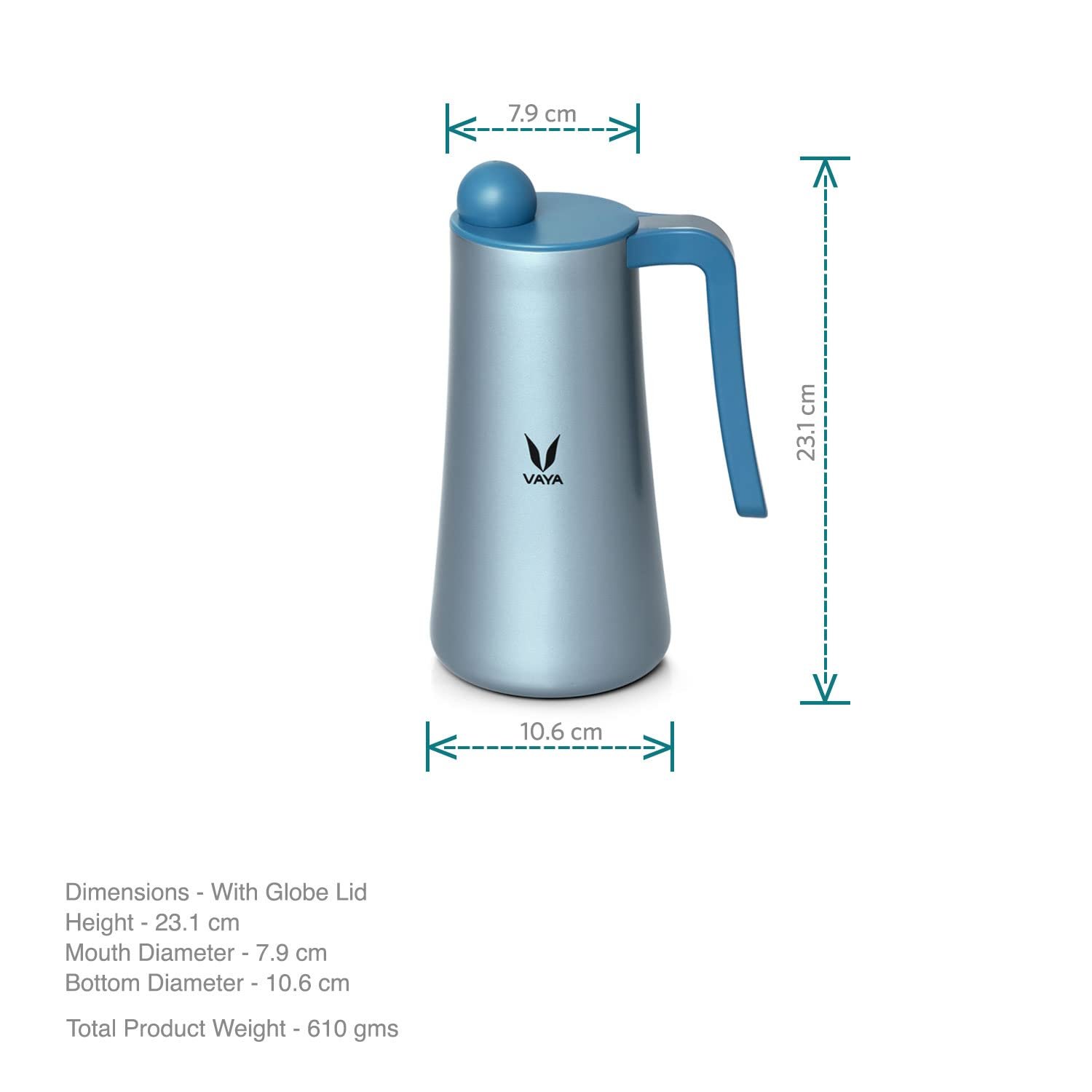 • What’s In The Box: One stainless steel TeaPot body with Handle, One BPA Free Globe Lid, Color Blue, Capacity 900 ml Tea or Coffee dispenser