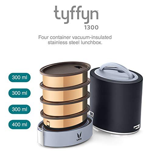 What’s In The Box:- One 400 ml Container, Three 300 ml Containers, Four Lids, Four Partitions, Base, a Vacuum Insulated Outer Shell; Colour: Black, Material: Stainless Steel, Container: Copper-finish, Shape: Oval, Capacity: 1300 ml.Ideal tiffin box for office for men and women. Premium Quality Containers and Partitions:- The premium polished containers add a touch of elegance to your lunchbox. Containers come with an easy-opening BPA-Free lid. Containers do not retain flavors or scents, so you can use it over and over again. Each container comes with a partition to arrange multiple food items in an appropriate proportion for you. The partitions do not let different foods to touch and get messy in the containers. The containers are dishwasher safe. Carry Meals On The Go – A well-balanced healthy lunch is very important for Teens and Office goers. This insulated lunch box can be used to carry fruit, veggies, sandwiches, carbs, meat, biryani, and even desserts. Perfect to carry lunch to college, work, camping, traveling, or any indoor or outdoor activities. Keeps Your Food Fresh and Warm with Advanced Technology:- Vaya Lunchbox is a double-walled vacuum-insulated, stainless steel tiffin box that ensures that your food stays warm and fresh for at least 4 – 5 hours. This hot box for lunch is convenient for you to enjoy tasty homemade food anywhere. One Year Warranty:- Warranty is applicable for a period of (1) year from the date of purchase. Please Email to the Vaya Customer Care address mentioned in the product packaging for all Warranty and Quality issues
