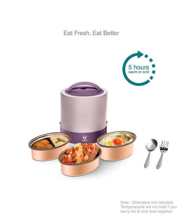 What’s In The Box:- One 600 ml Container & One 400 ml Container, Two Lids, Two Partitions, Base, a Vacuum Insulated Outer Shell; Colour: Purple, Material: Stainless Steel, Container: Copper-finish, Shape: Oval, Capacity: 1000 ml.Ideal tiffin box for office for men and women.