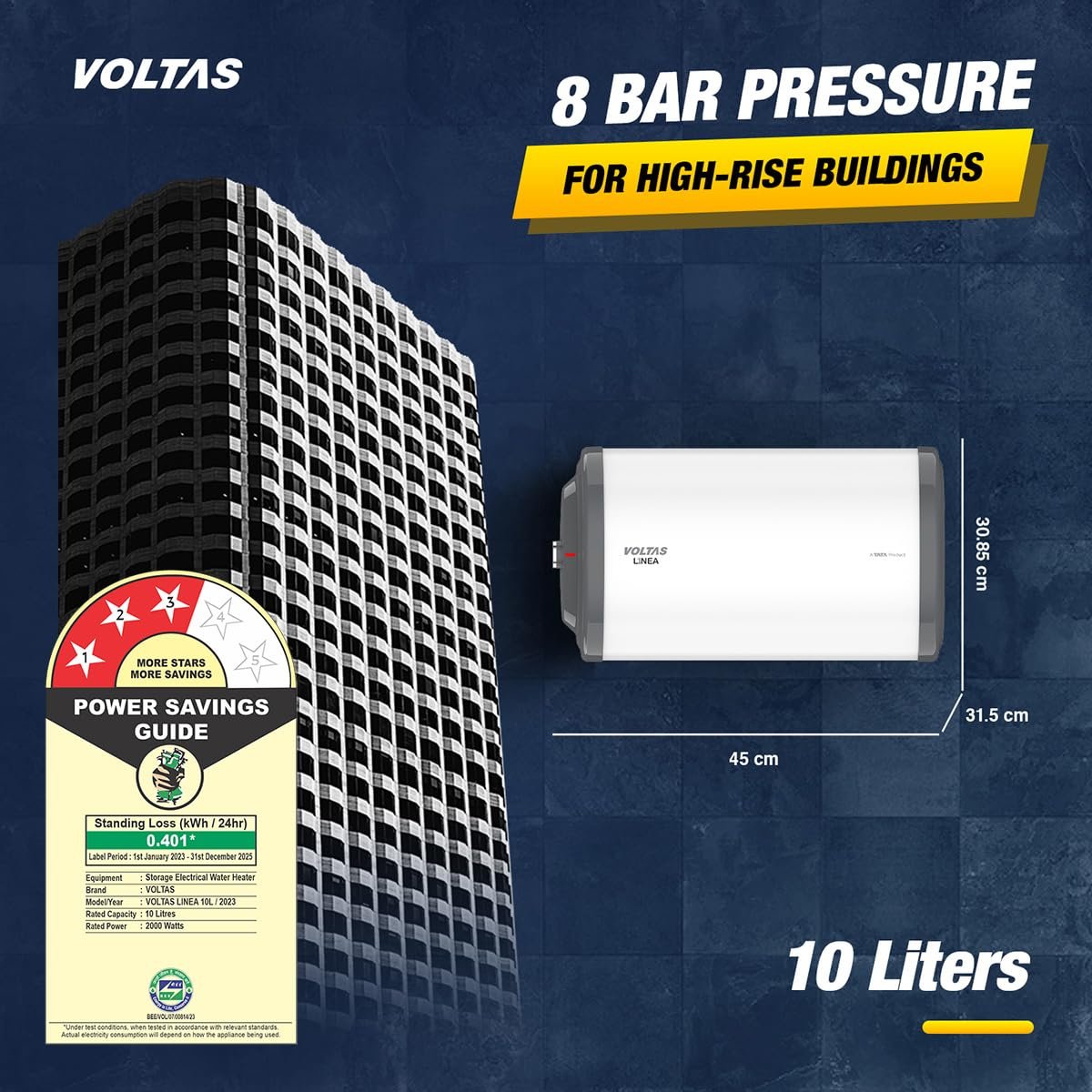 • 8-bar High-Pressure: The Voltas Linea water heater is designed to withstand high pressure, making it suitable for high-rise buildings and applications involving high-pressure pumps.