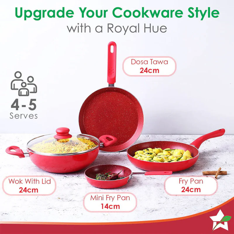Wonderchef Royal Velvet Non-stick 5-pcs Cookware Set Fry Pan with Lid, Kadhai, Dosa Tawa, Mini Fry Pan|Induction Ready|Soft-touch handles|Non Toxic IVirgin Aluminium|3 mm thick|2 years warranty|Purple