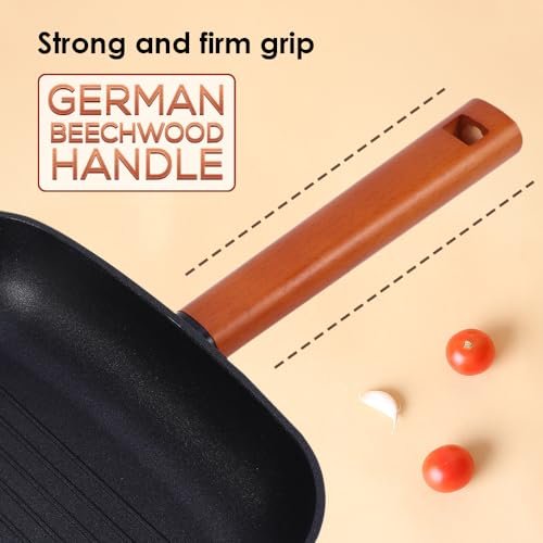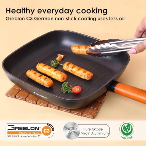 Wonderchef Caesar Forged Virgin Aluminium Grill Pan, 24cm, Black, Greblon C3 Non-stick Coating, PFOA Free, German Beechwood Handles, Use for Grilling Tikkis, Breads, Rolls, Meat, Paneer